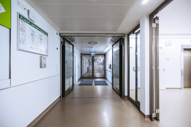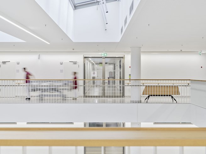 Das Herzstück von Haus F ist die große neue interdisziplinäre Intensivstation. Auf 1.900 Quadratmetern ist Platz für mindestens 62 Intensivpatienten, verteilt auf 36 Zimmer. Hier verschmelzen die bisherige internistische, operative und neurologische Intensivstation zu einer großen interdisziplinären Einheit. Ein zentraler offener Stützpunkt unterstützt die Teamarbeit. Die Zimmer sind ausreichend groß um gemeinsam pflegerisch und ärztlich am Bett im Team arbeiten zu können. Fenster und Türen zwischen den Zimmern erleichtern den Mitarbeitenden die Versorgung der Patienten. Kleine Lichter, große Fenster und eine helle Gestaltung sorgen für eine angenehme Atmosphäre für Patient:innen und Personal.