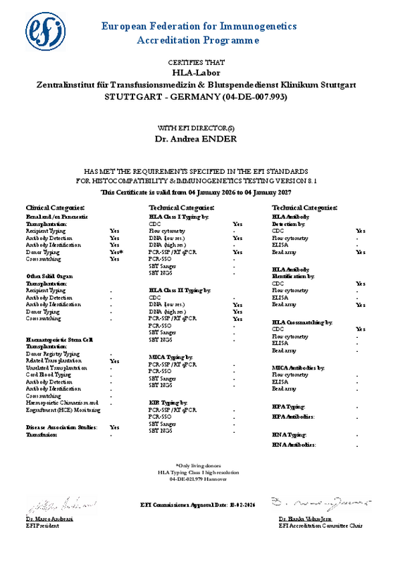 - Zertifizierung des HLA-Labors durch die Europeen Federation for Immunogenetics (EFI).