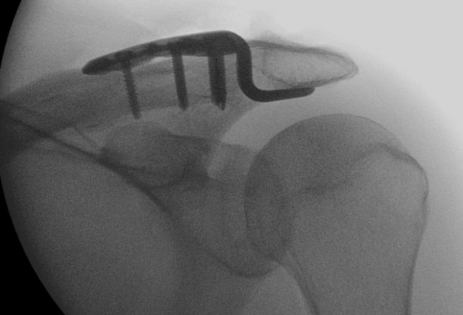 Offene Stabilisierung, bei der eine Metallplatte unter das Akromion greift und das Schlüsselbein fixiert. Gute Stabilität, jedoch häufig Irritationen subakromial, weshalb eine Metallentfernung nach ca. 3 Monaten empfohlen wird.