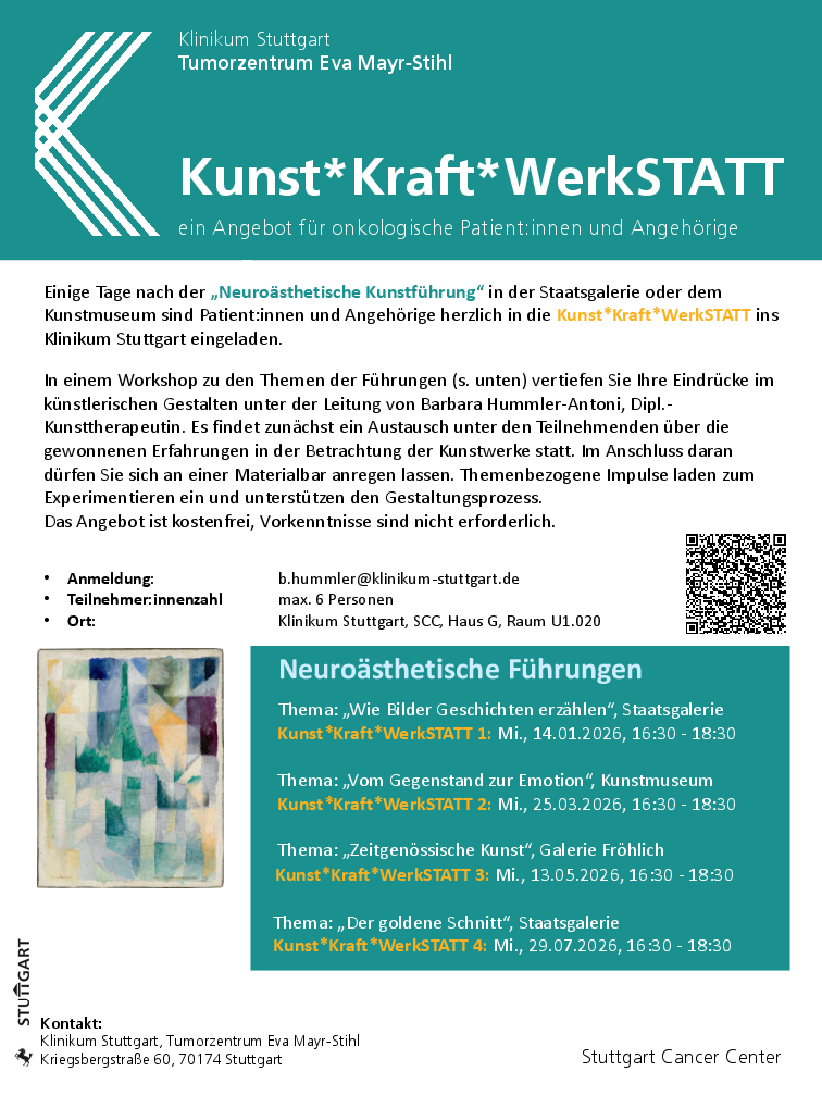 Einige Tage nach der „Neuroästhetische Kunstführung“ in der Staatsgalerie oder dem Kunstmuseum sind Patient:innen und Angehörige herzlich in die Kunst*Kraft*WerkSTATT ins Klinikum Stuttgart eingeladen.
